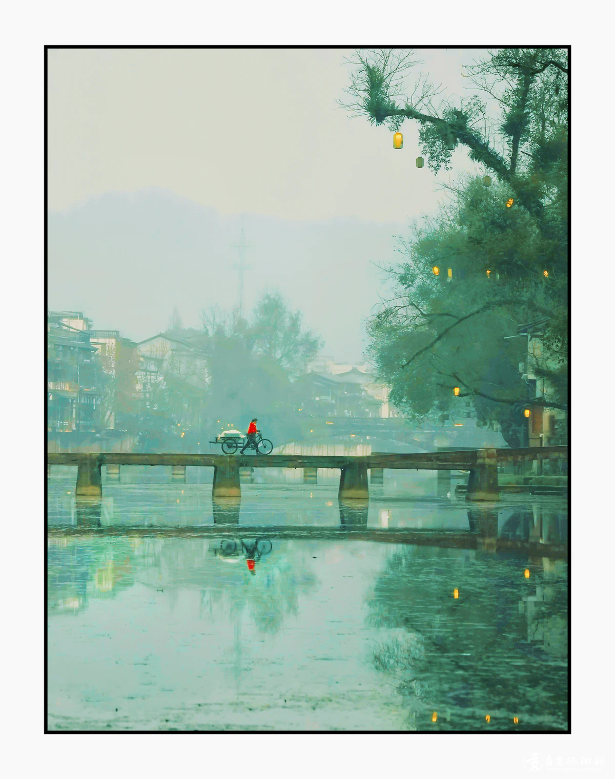 晨雾笼川南,古镇的石桥静卧白沫江。红衣行者踏车穿雾,身影与岸灯一同映在如镜水面。远山含黛,古村朦胧,一树暖灯晕开湿冷晨色。镜头定格川西水乡的烟火与诗意,在虚实之间,晕开最温柔的晨曲。