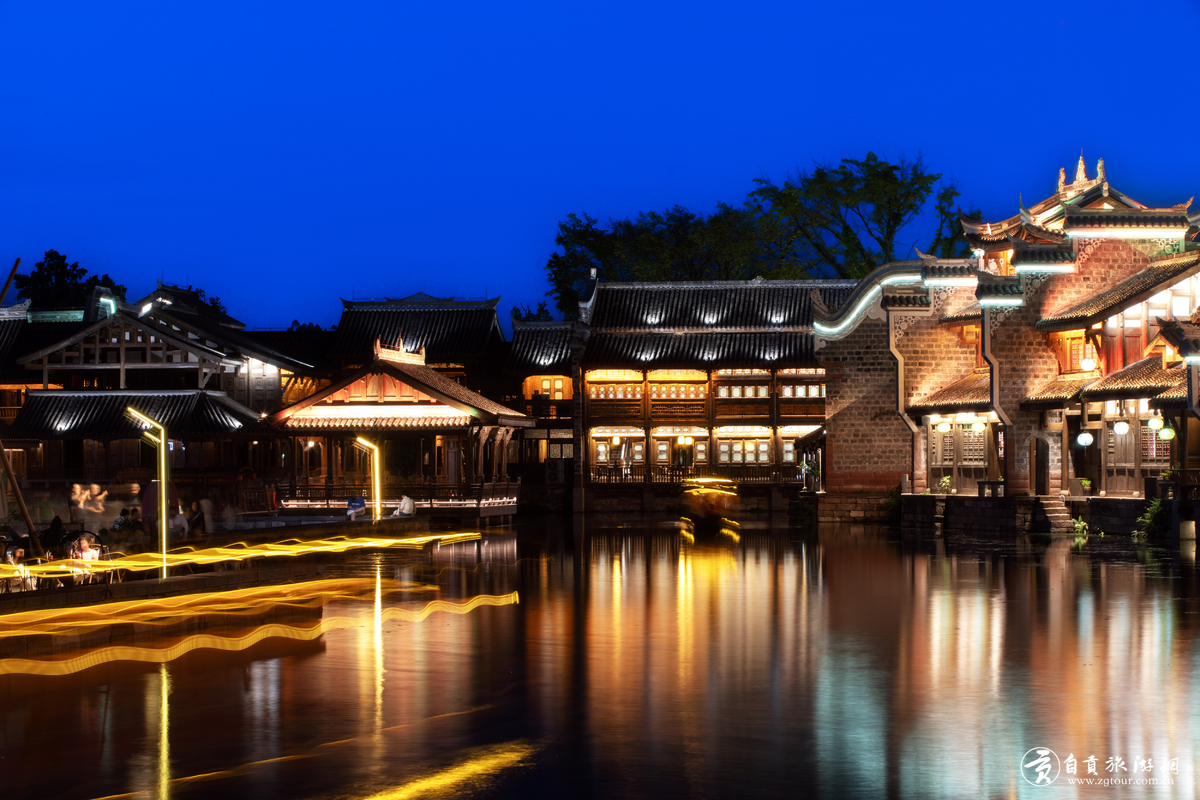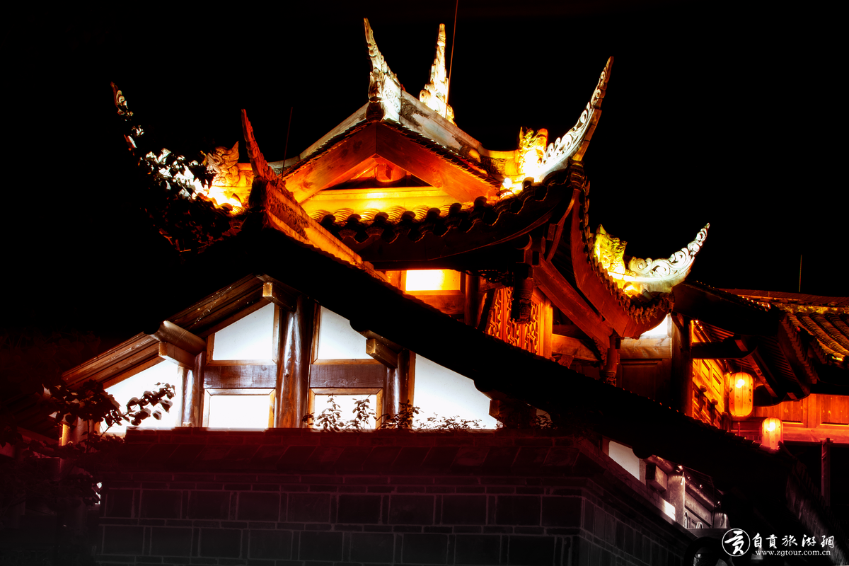 古镇的夜色,最动人的莫过于那份古今交融的韵味。旋螺殿的琉璃瓦在灯光下泛着微光,殿内的雕梁画栋虽在夜色中略显朦胧,却更显古朴庄重。不远处的古戏台,飞檐翘角,轮廓分明,仿佛还能听到昔日戏台上的咿呀唱腔,在夜色中久久回荡。沿街的老建筑错落有致,青瓦叠叠,红灯笼串串,既有江南水乡的温婉,又有川南古镇的醇厚。偶尔有穿汉服的姑娘款款走过,衣袂飘飘,与古镇的夜色融为一体,让人恍惚间穿越了千年。