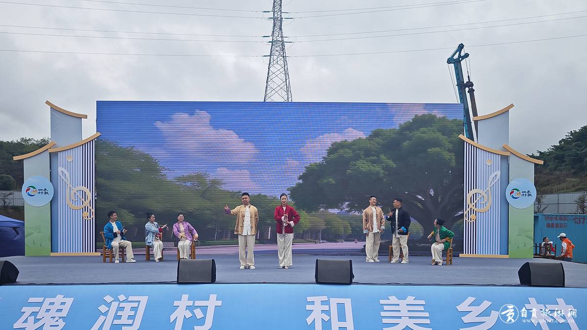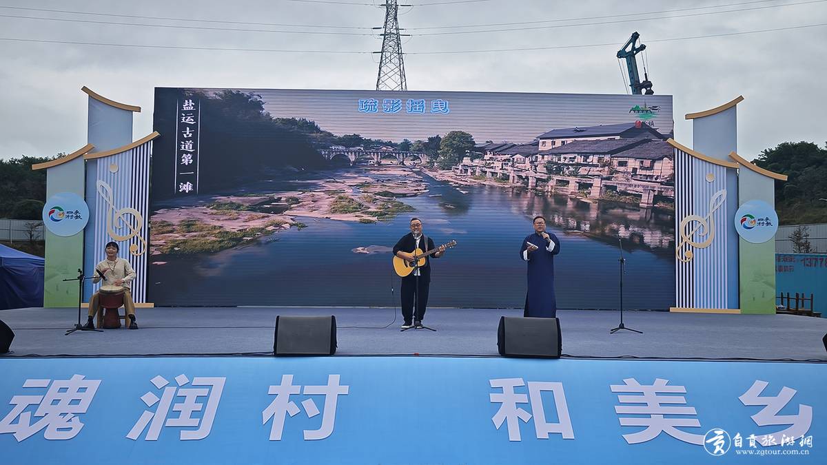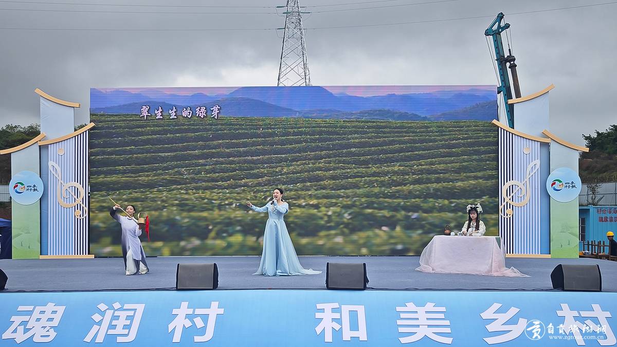 当天,活动在莲厢表演《天亮了+天车下》中拉开帷幕,让村民在欢快的节奏中感受非遗文化的魅力。随后,13首鲜明地域特色、展现乡村振兴的优秀村歌作品及小品精彩呈现,四川盘子《春风送暖》以一场社区“文明家庭”评选为叙事核心,生动展现了新时代基层社区和谐互助、崇德向善的精神风貌;女声独唱《茶乡恋歌》将茶艺搬上舞台,在歌声中“品尝”荣县花茶的清香;民谣《盐情艾叶滩》带 领观众在质朴的韵律中,回望古盐道上那些动人的故事。