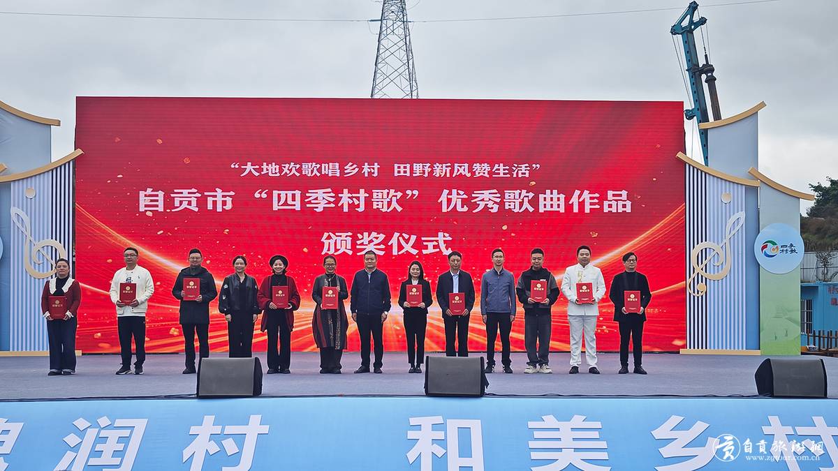 当天,活动现场为10首优秀“村歌”作品颁发荣誉证书。据悉,为推动乡村文化振兴,自贡市文化馆于4月30日组织开展了“四季村歌”创作培训,并以“大地欢歌唱乡村 田野新风赞生活”为主题,面向区县公开征集“四季村歌”作品。经过5个月征集选拔,共征集原创歌曲50首,其中29首歌曲进入复评,最终评选出10首优秀“村歌”作品。