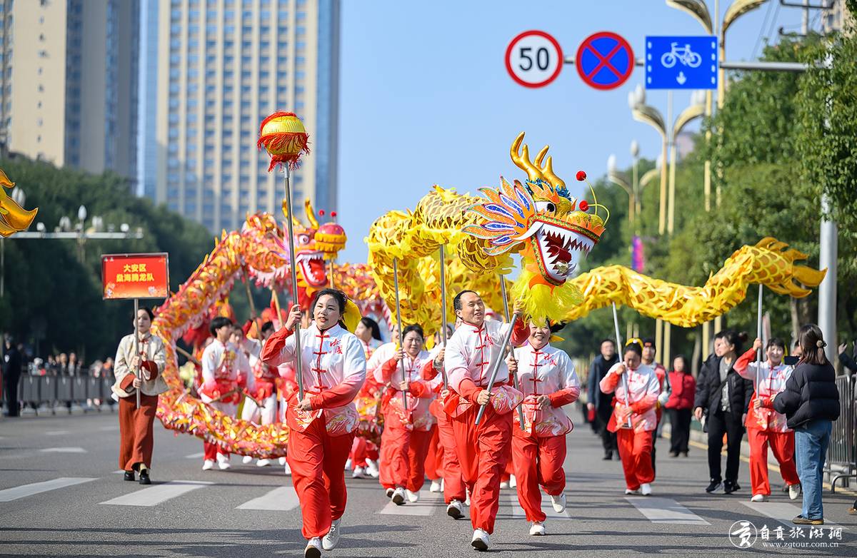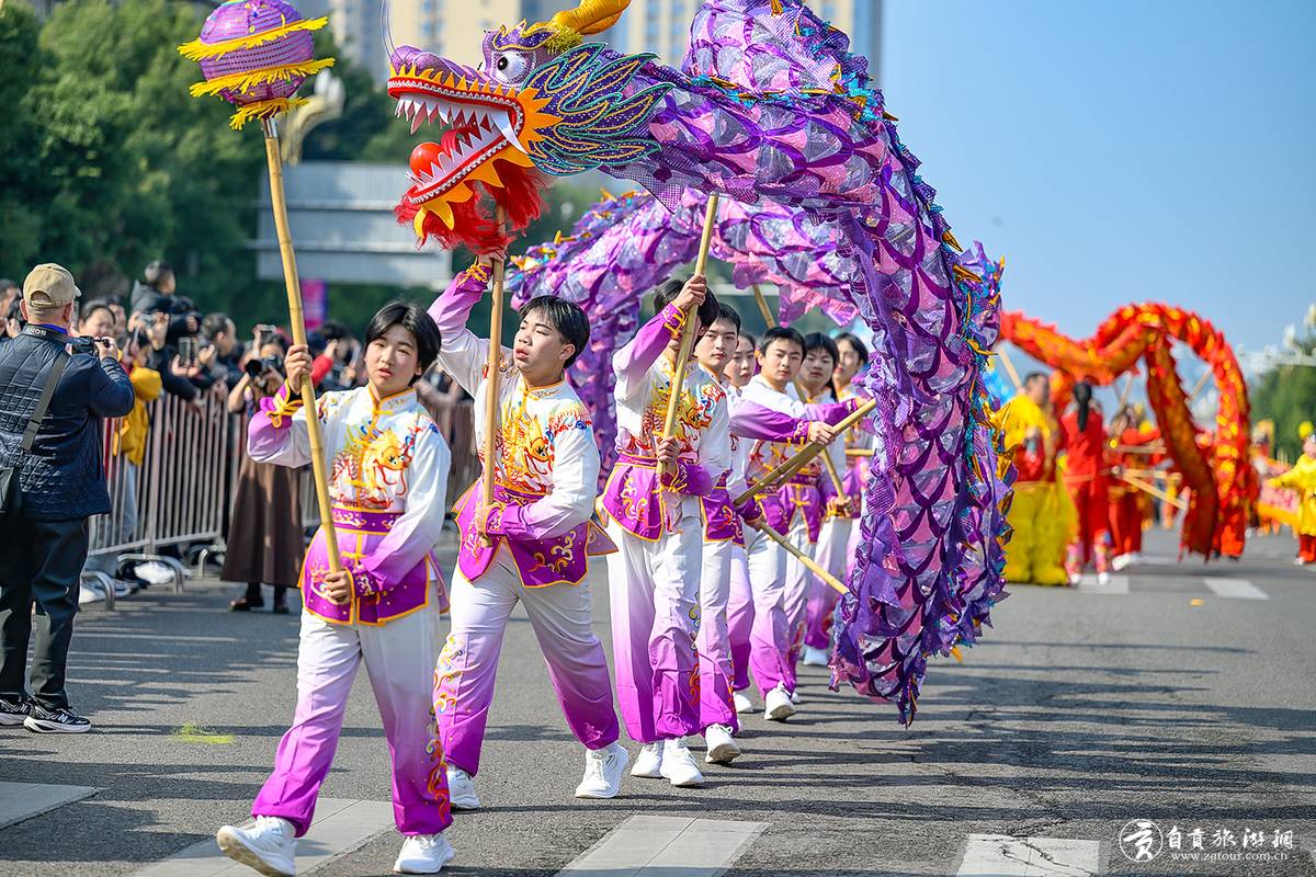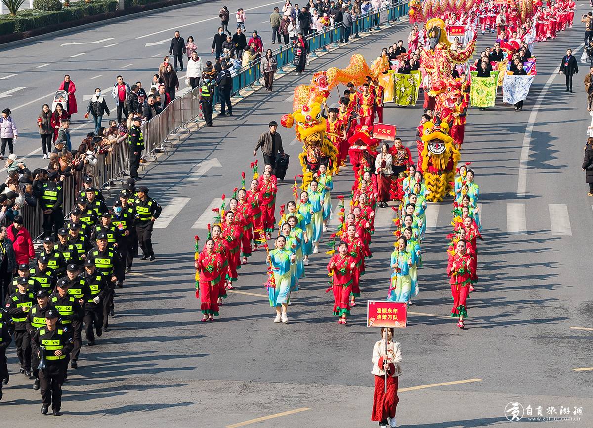 龙狮展演意犹未尽,民俗巡游再掀热潮。上午10时30分,由全省20个市(州)龙狮队伍及自贡9支特色民俗方阵组成的千余人巡游队伍,从自贡衡川实验学校出发,沿2.5公里线路行进至县文体中心。